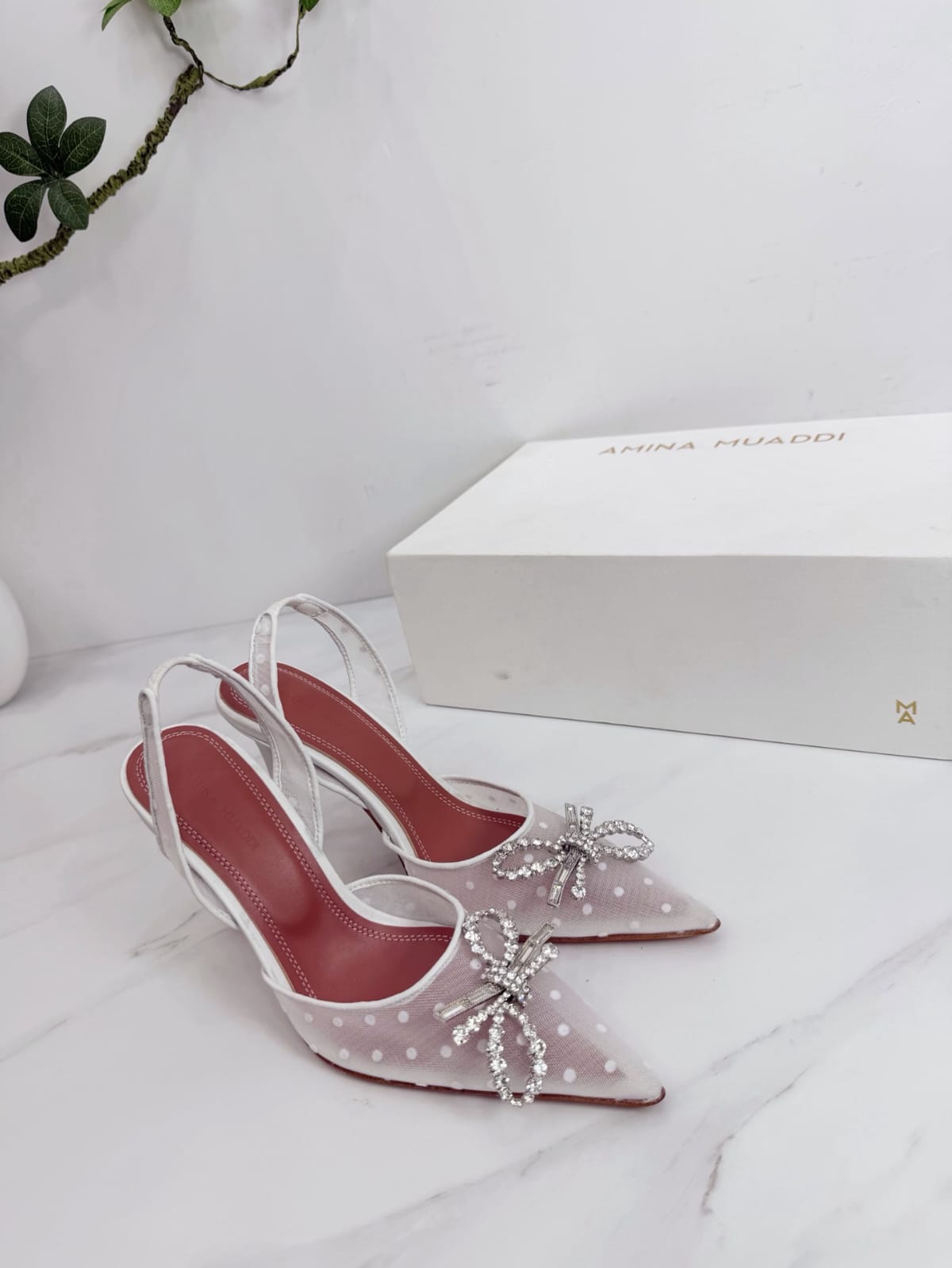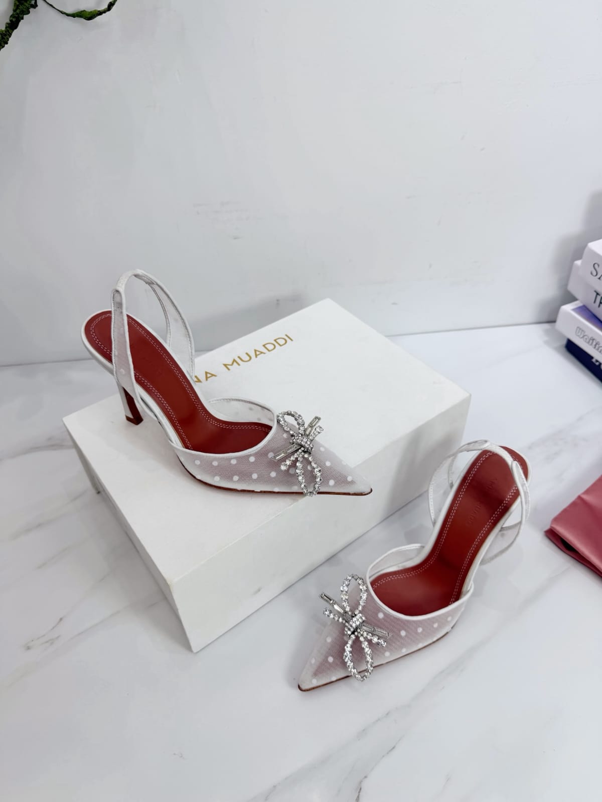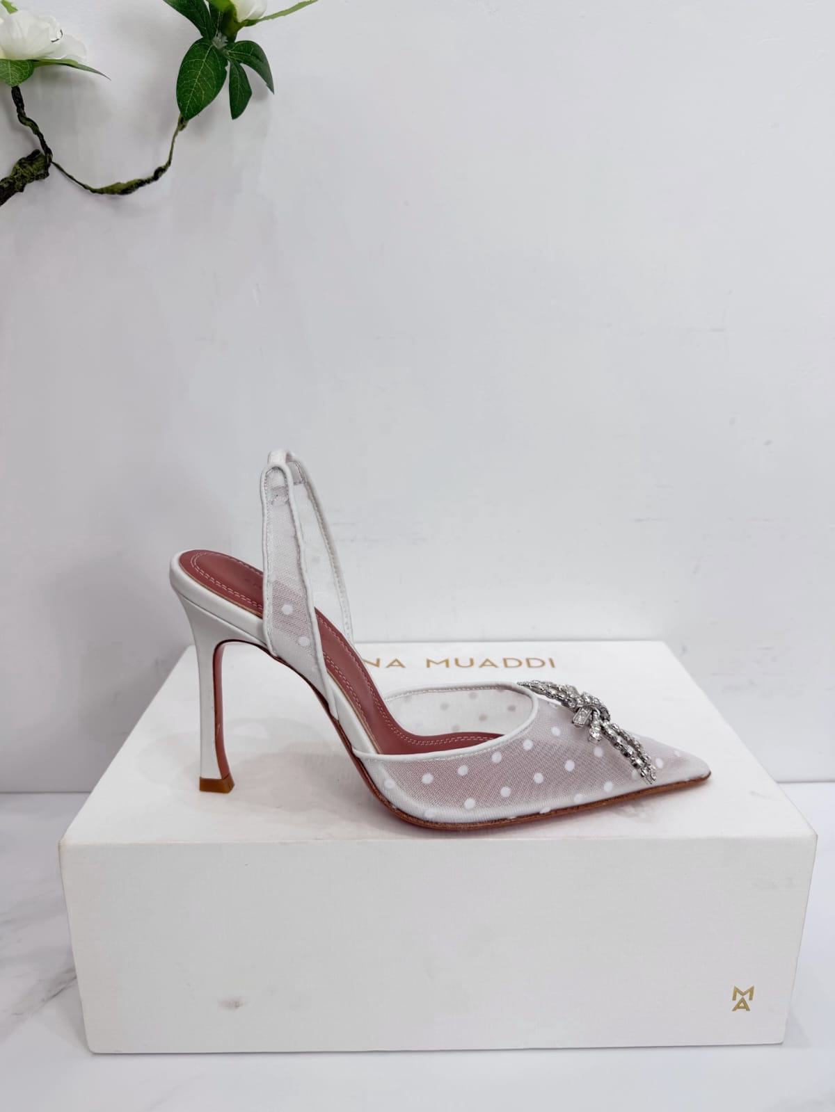 The Amina Muaddi Rosie Glass slingback pumps feature a striking translucent design paired with the brand’s iconic flared heel. Elegant and contemporary, they are perfect for statement evening looks.