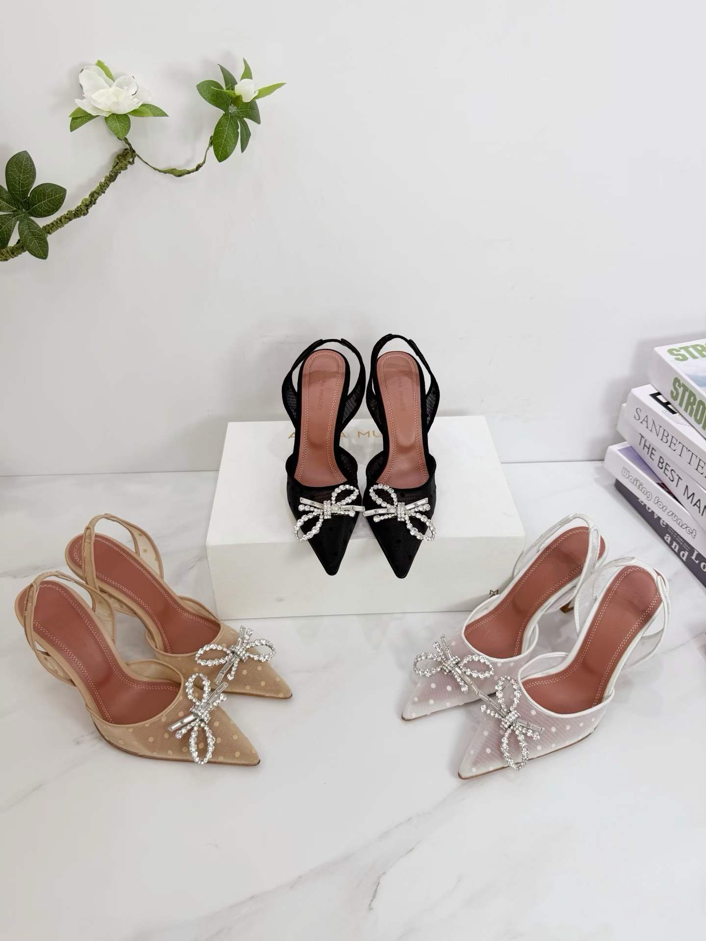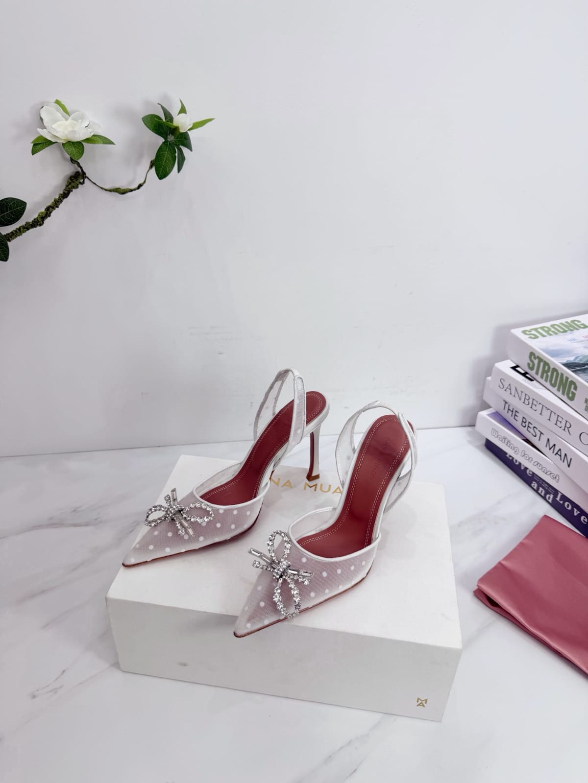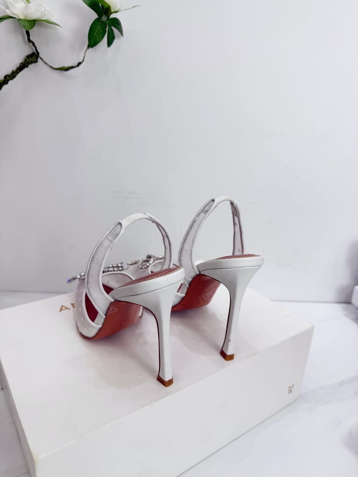 The Amina Muaddi Rosie Glass slingback pumps feature a striking translucent design paired with the brand’s iconic flared heel. Elegant and contemporary, they are perfect for statement evening looks.