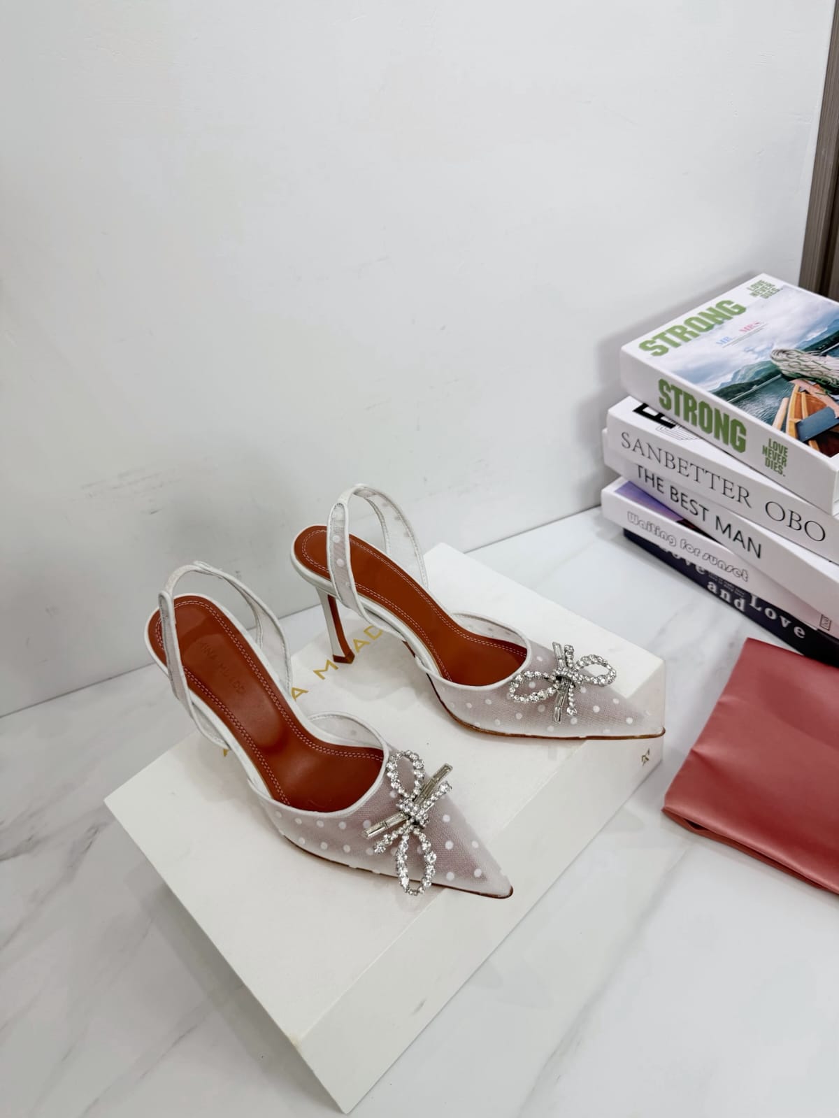 Amina Muaddi Rosie Glass slingback pumps with signature flared heel and modern design.