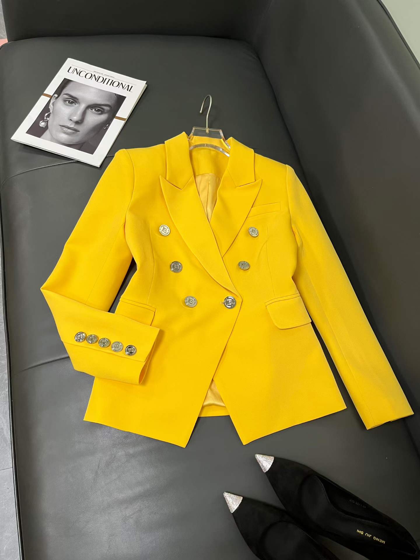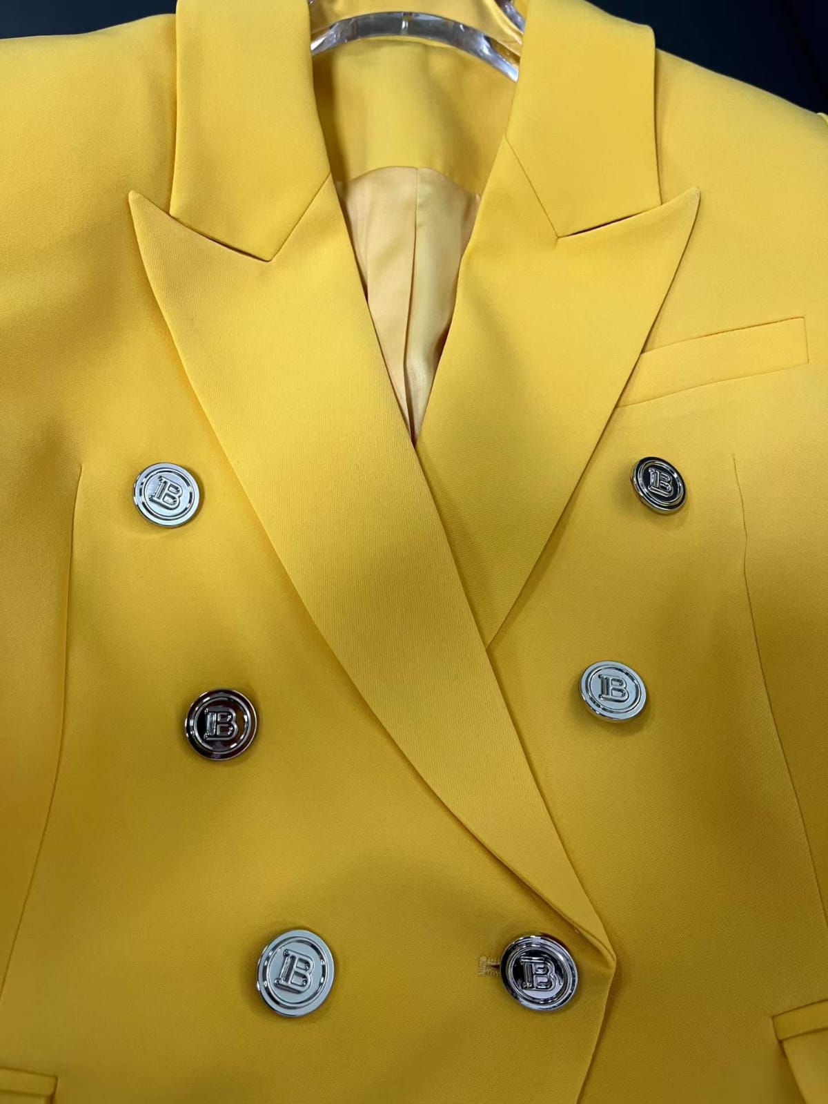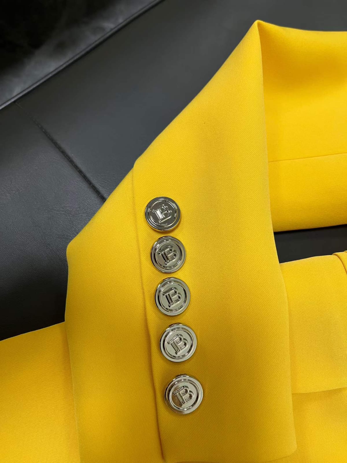 Make a bold statement with this Balmain yellow double-breasted blazer, a signature piece that embodies the brand’s structured tailoring and luxury craftsmanship. Designed with sharp shoulders, a fitted silhouette, and Balmain’s iconic gold-tone buttons, this blazer adds a vibrant yet sophisticated touch to any wardrobe.