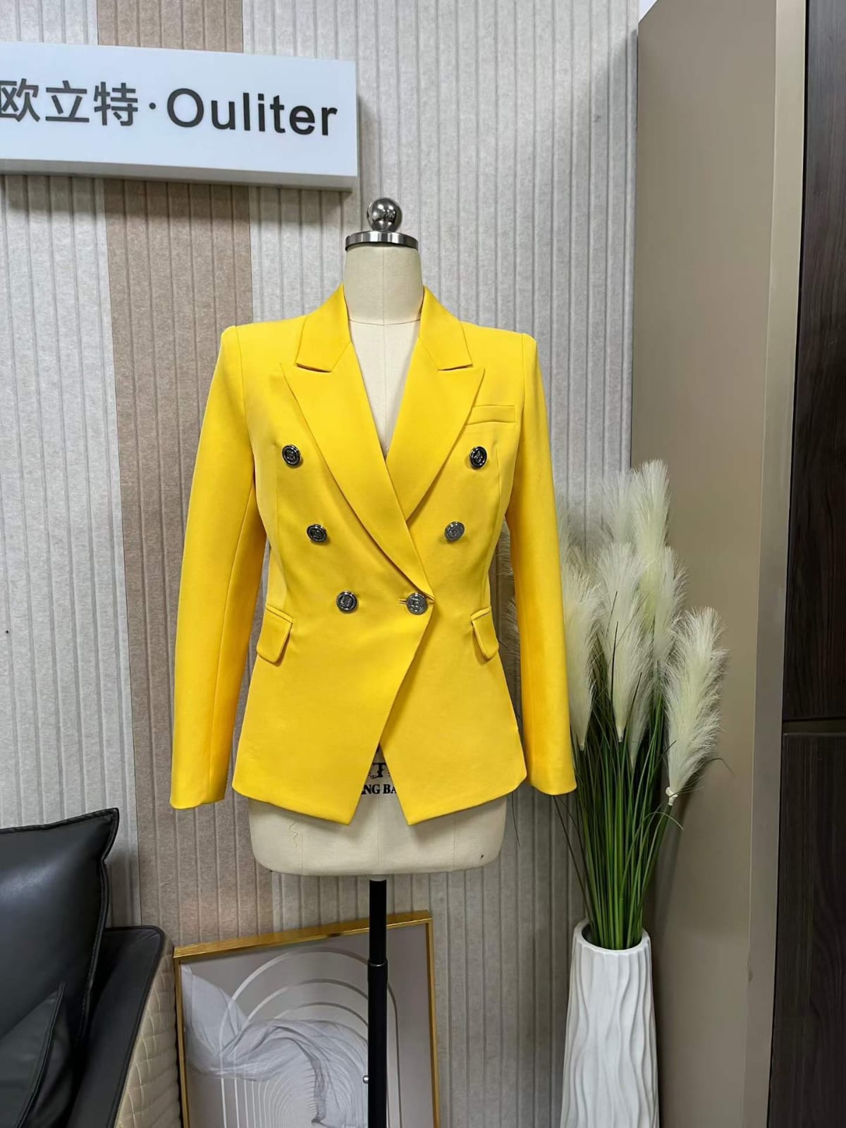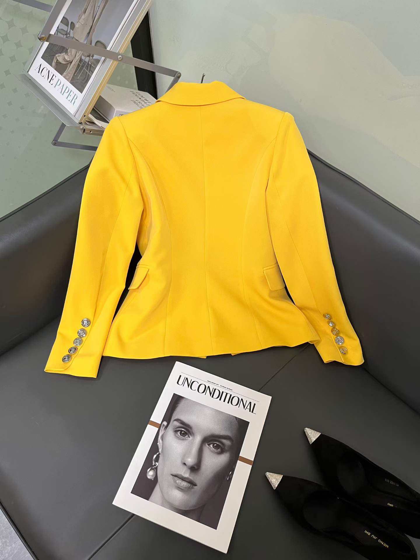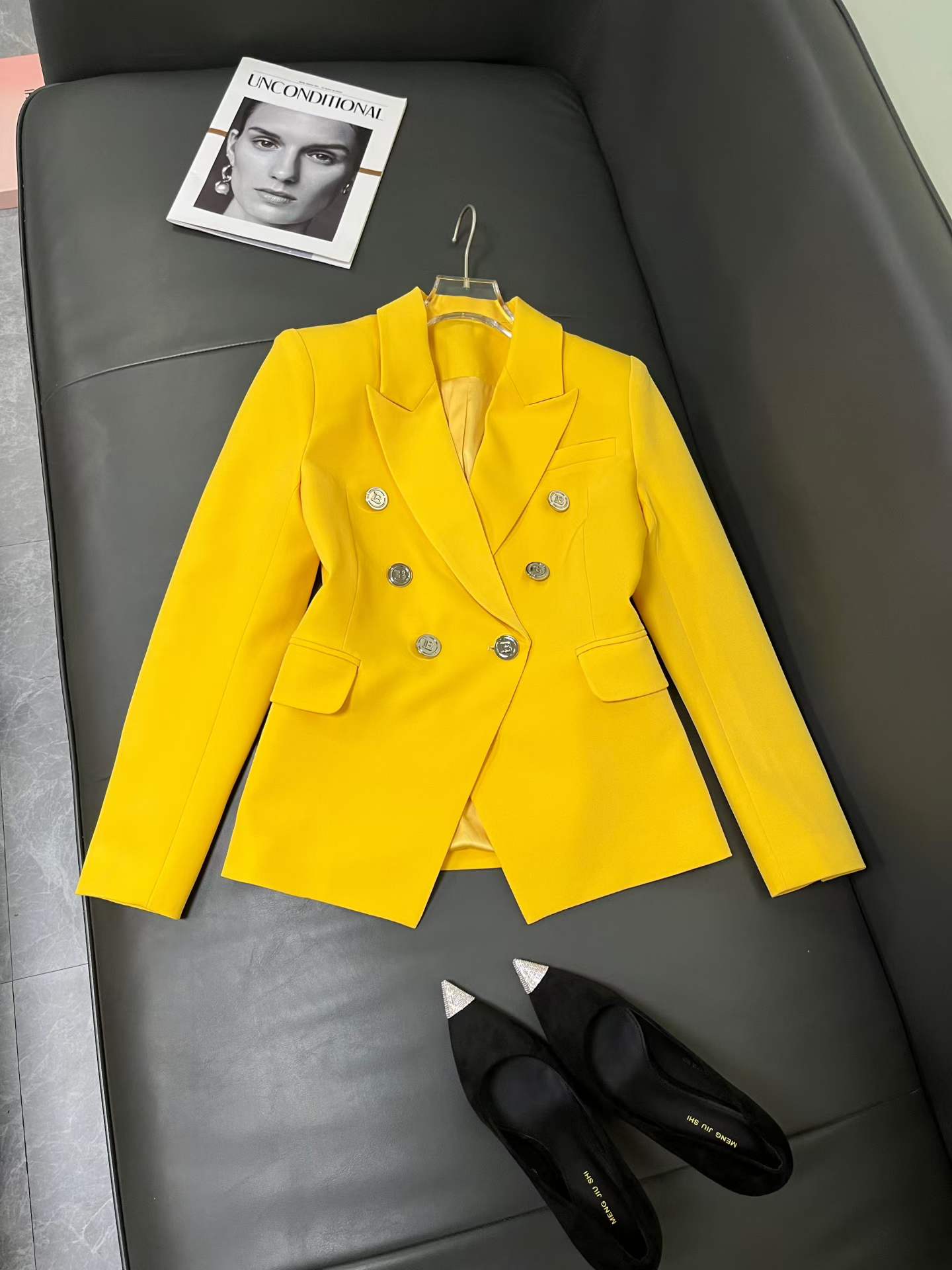 Make a bold statement with this Balmain yellow double-breasted blazer, a signature piece that embodies the brand’s structured tailoring and luxury craftsmanship. Designed with sharp shoulders, a fitted silhouette, and Balmain’s iconic gold-tone buttons, this blazer adds a vibrant yet sophisticated touch to any wardrobe.