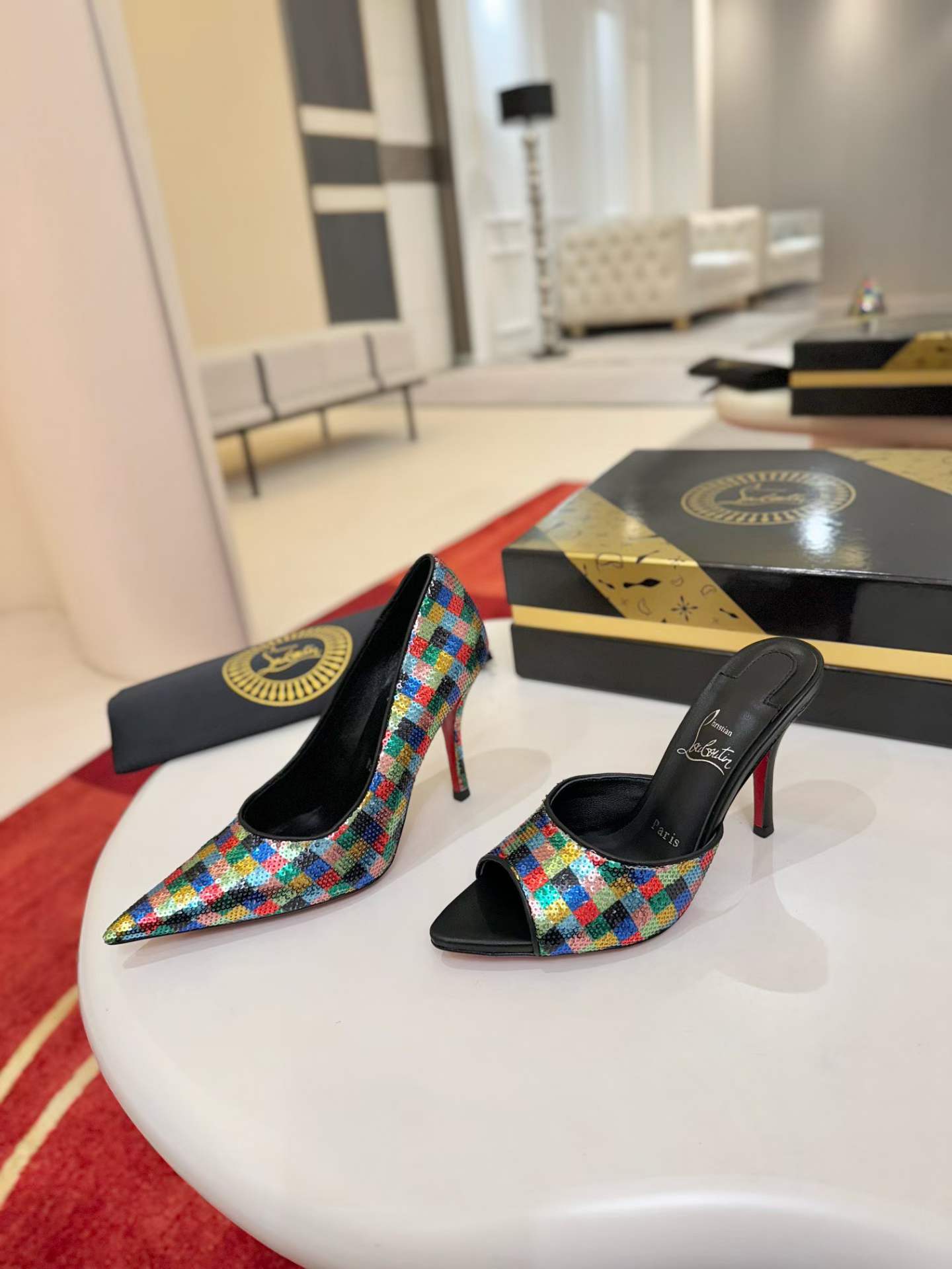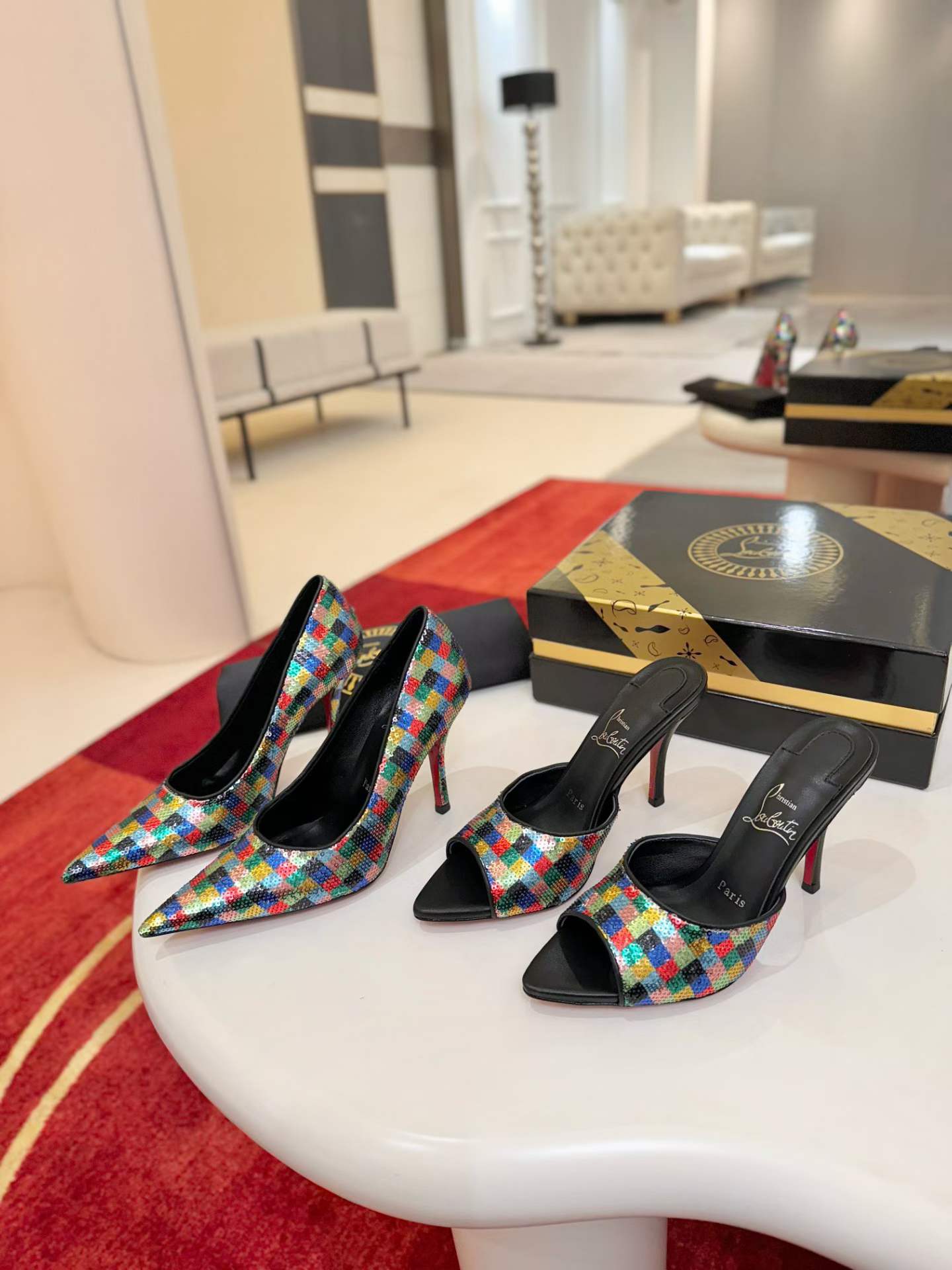 Christian Louboutin Miss Z Arlequin pumps and mule sandals with signature red sole design.