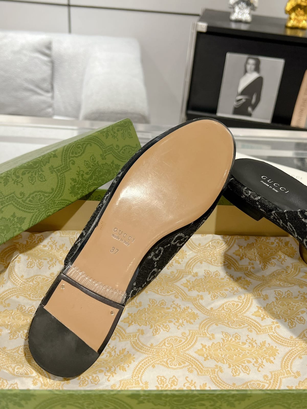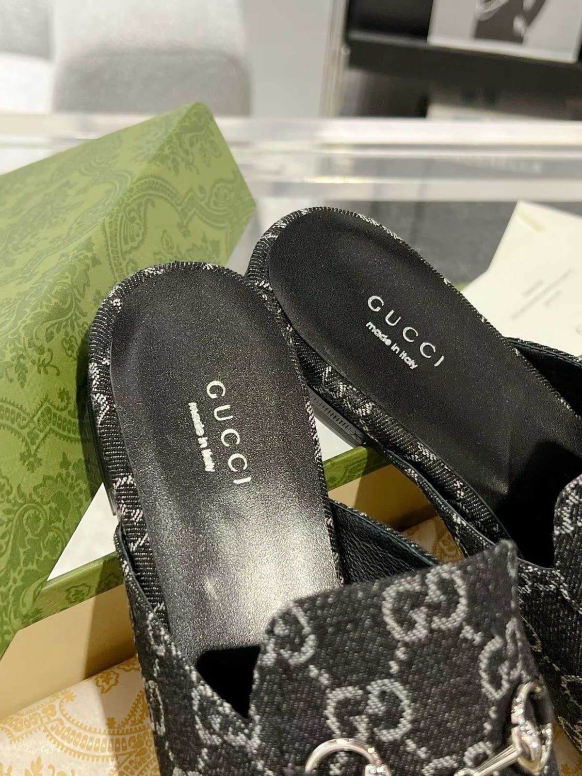 Shop Gucci Princetown GG denim slippers for women. Iconic designer slip-ons with heritage detailing.