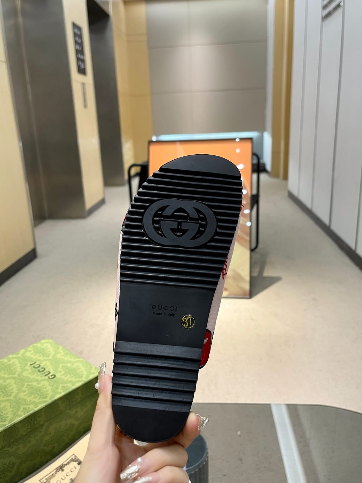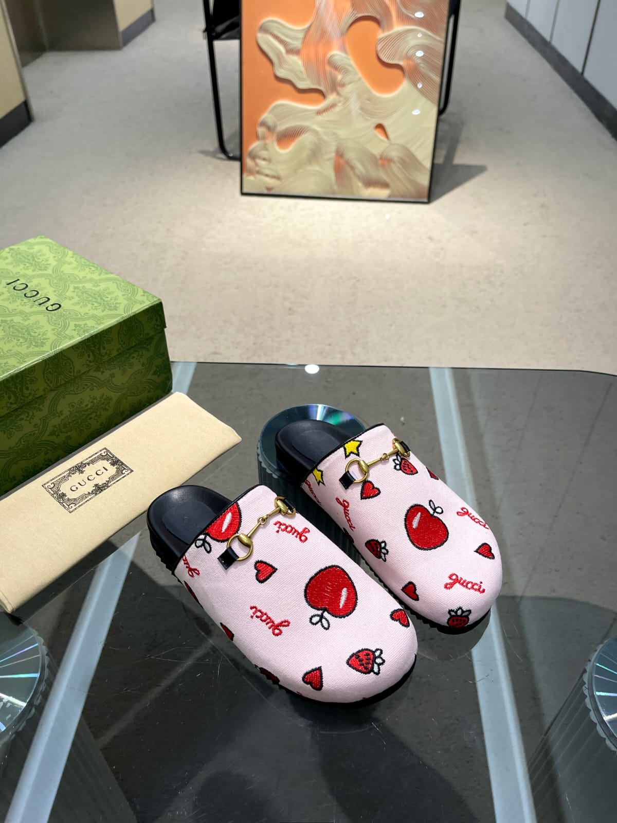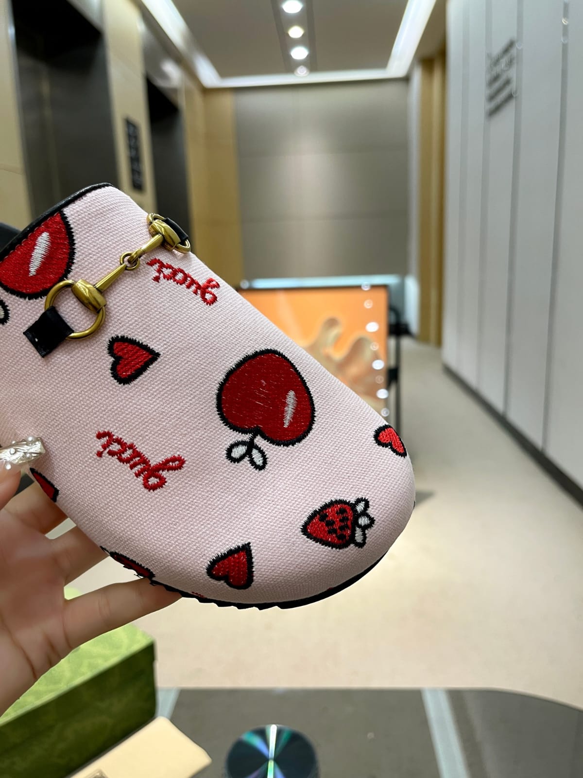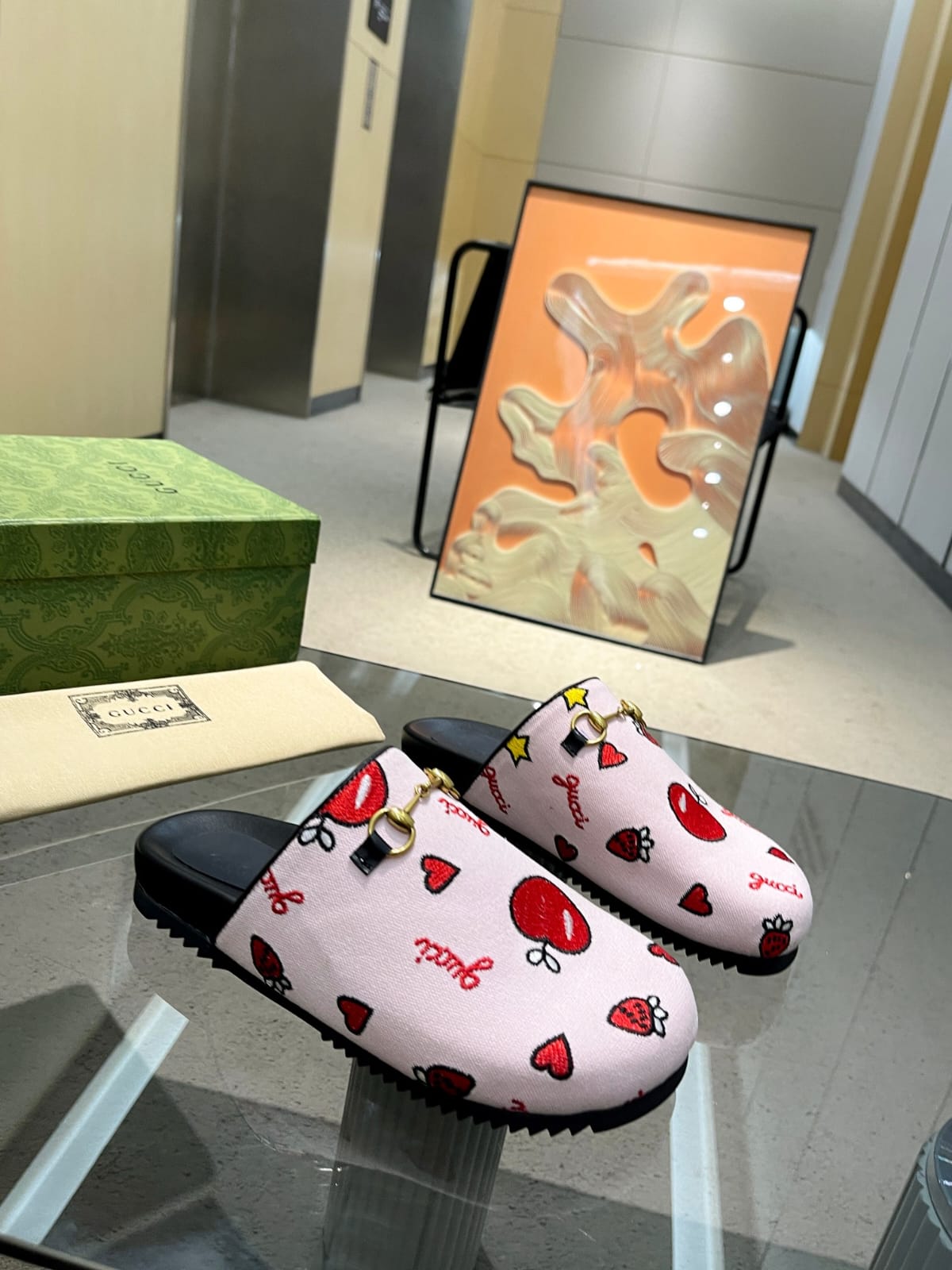 Gucci Princetown mules with strawberry and heart print on canvas.