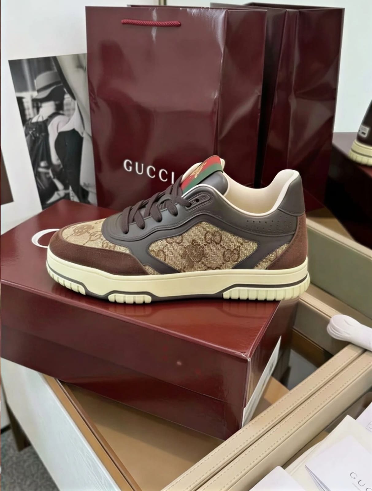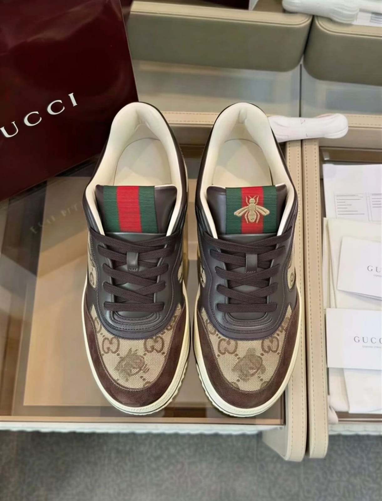 Crafted from Gucci’s signature GG canvas, these Re-Web sneakers feature a beige and dark brown colorway with the classic web stripe detail. The timeless design and comfortable fit make them a versatile luxury footwear option.