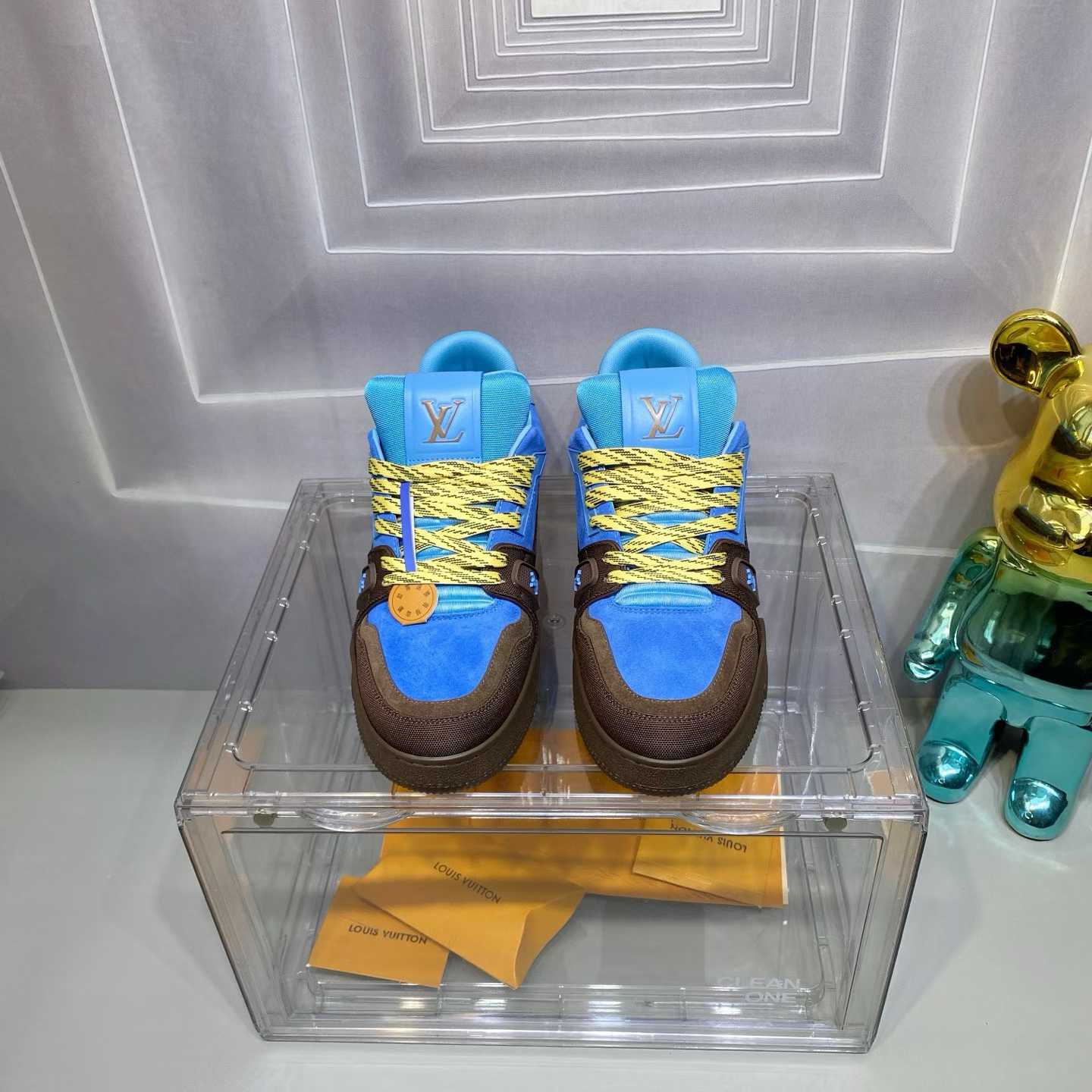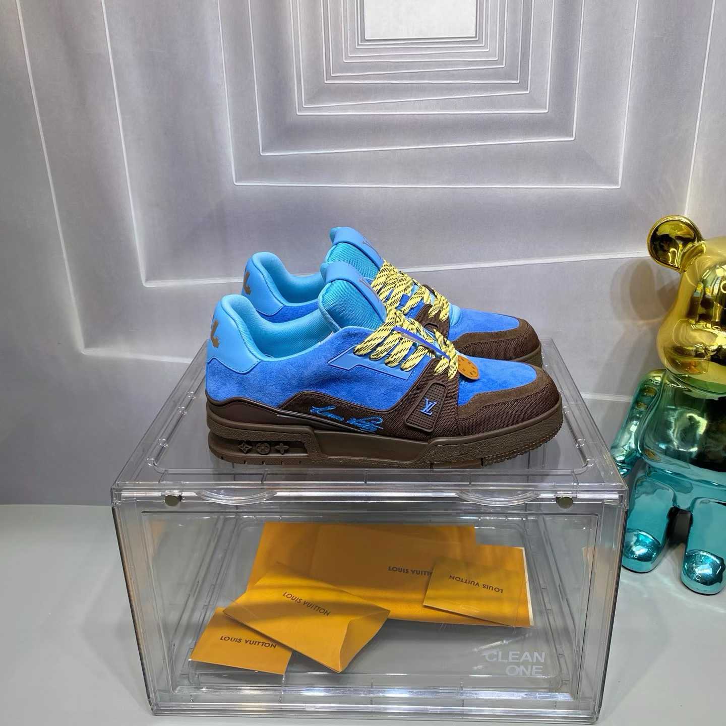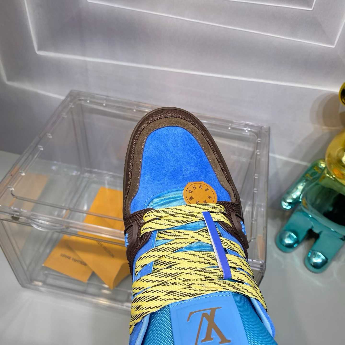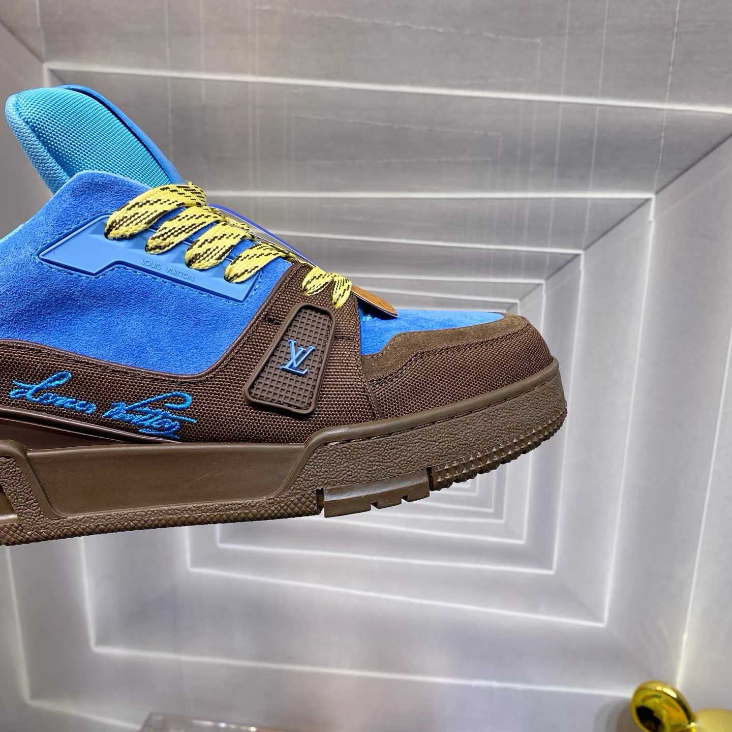 Explore Louis Vuitton LV Trainer sneakers in brown and blue. Luxury designer trainers with iconic LV details.