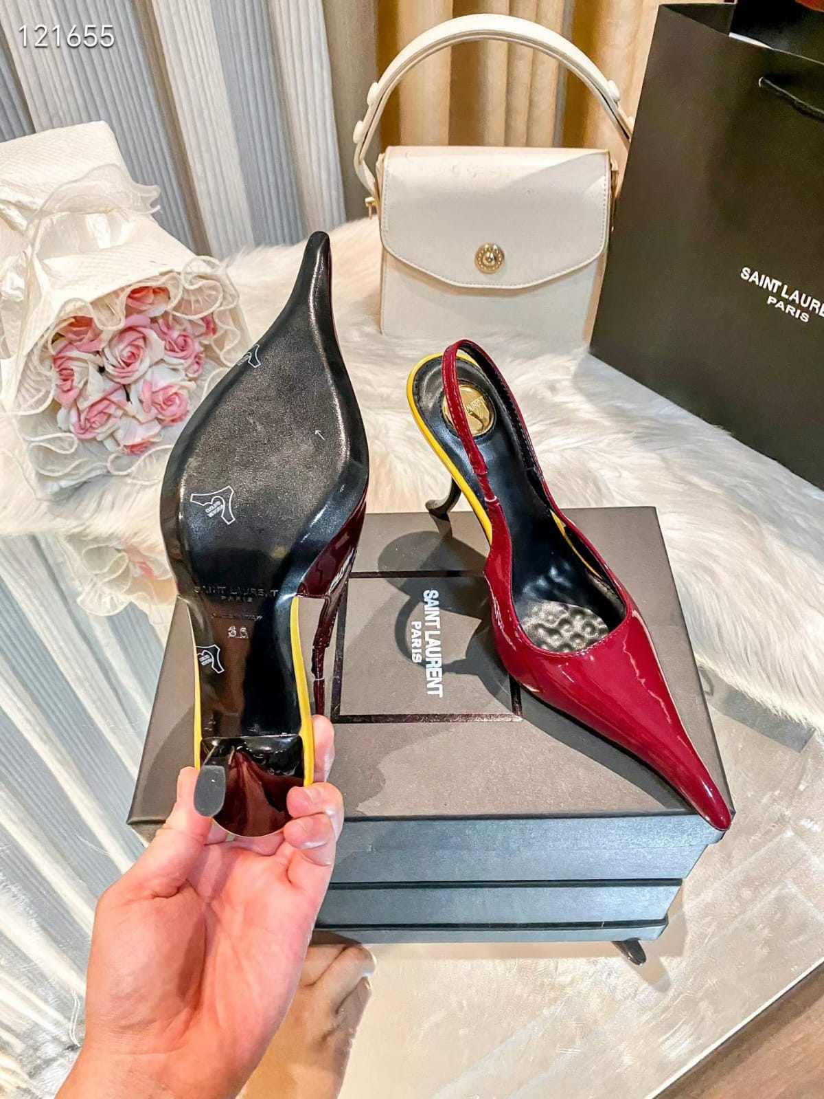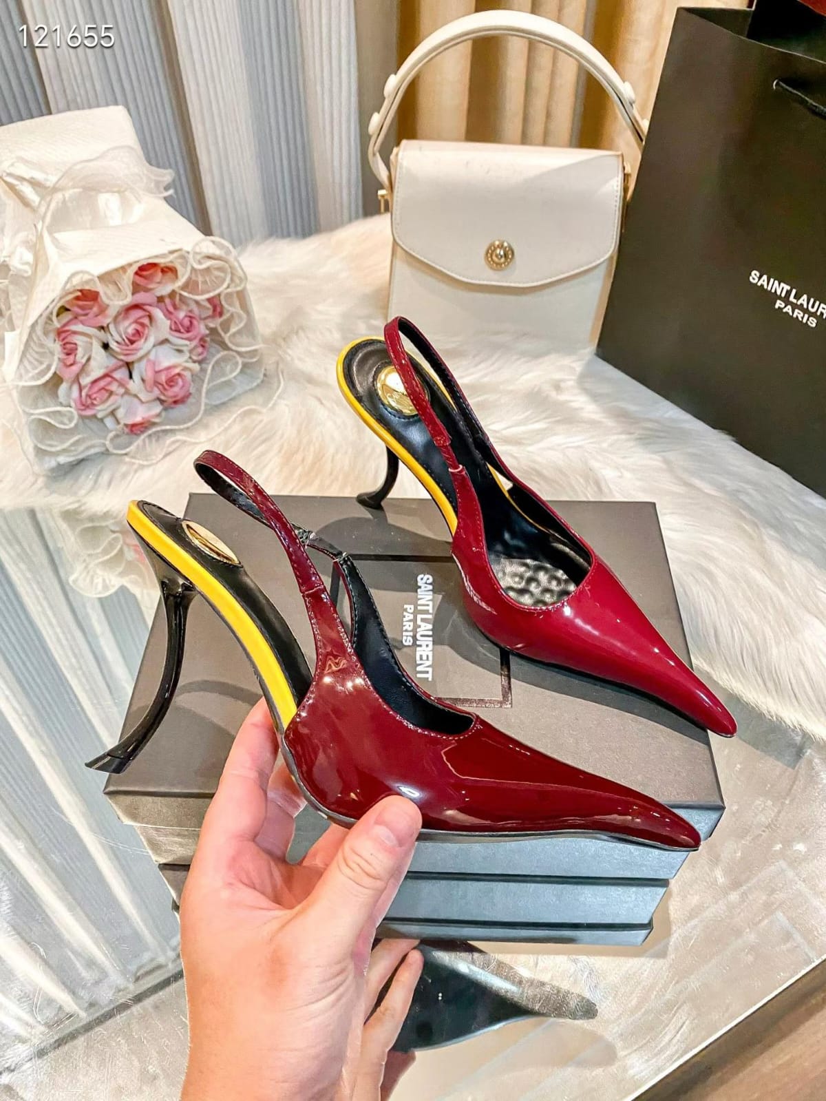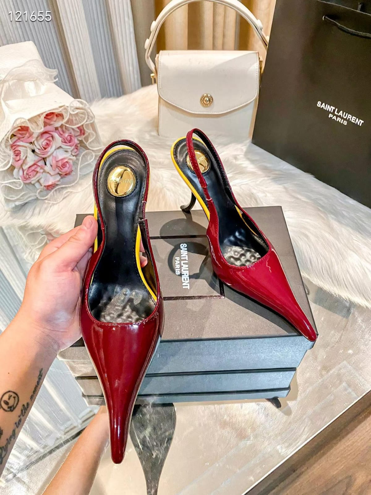 Saint Laurent Burgundy Patent Leather Slingback Pumps — elegant glossy patent leather designer heels.