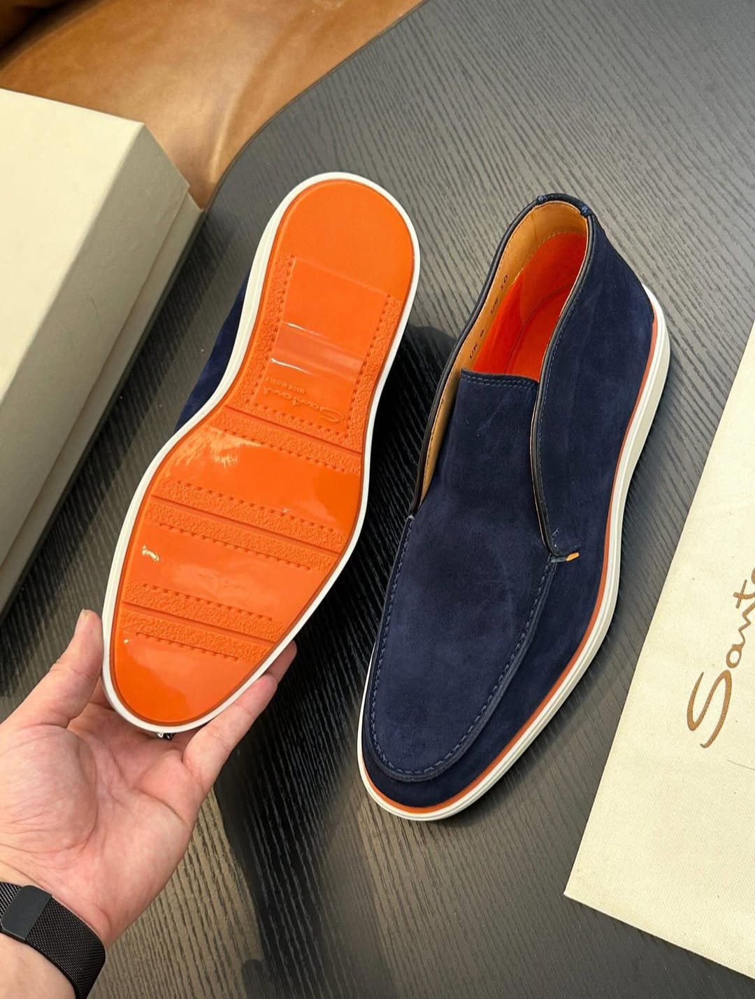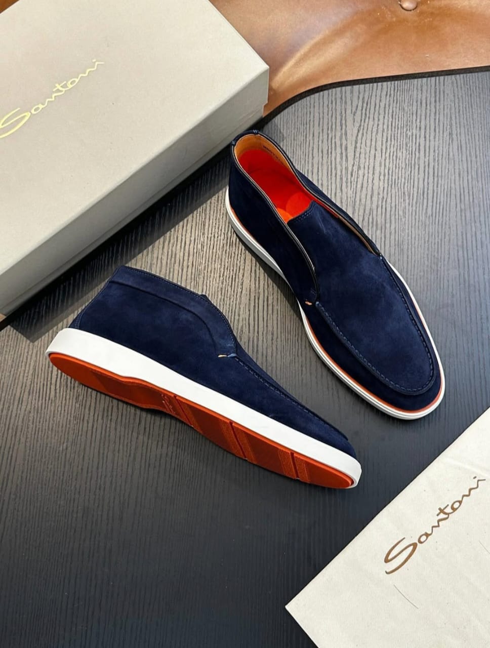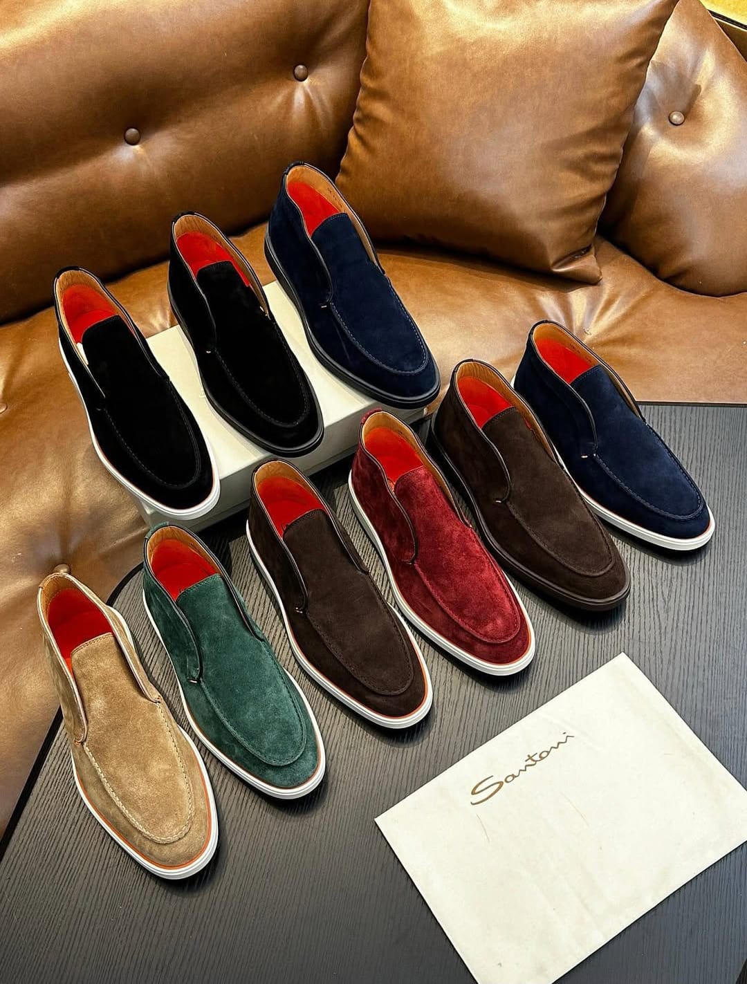 Shop Santoni suede slip-on loafers for men. Elegant Italian designer footwear crafted from premium suede.